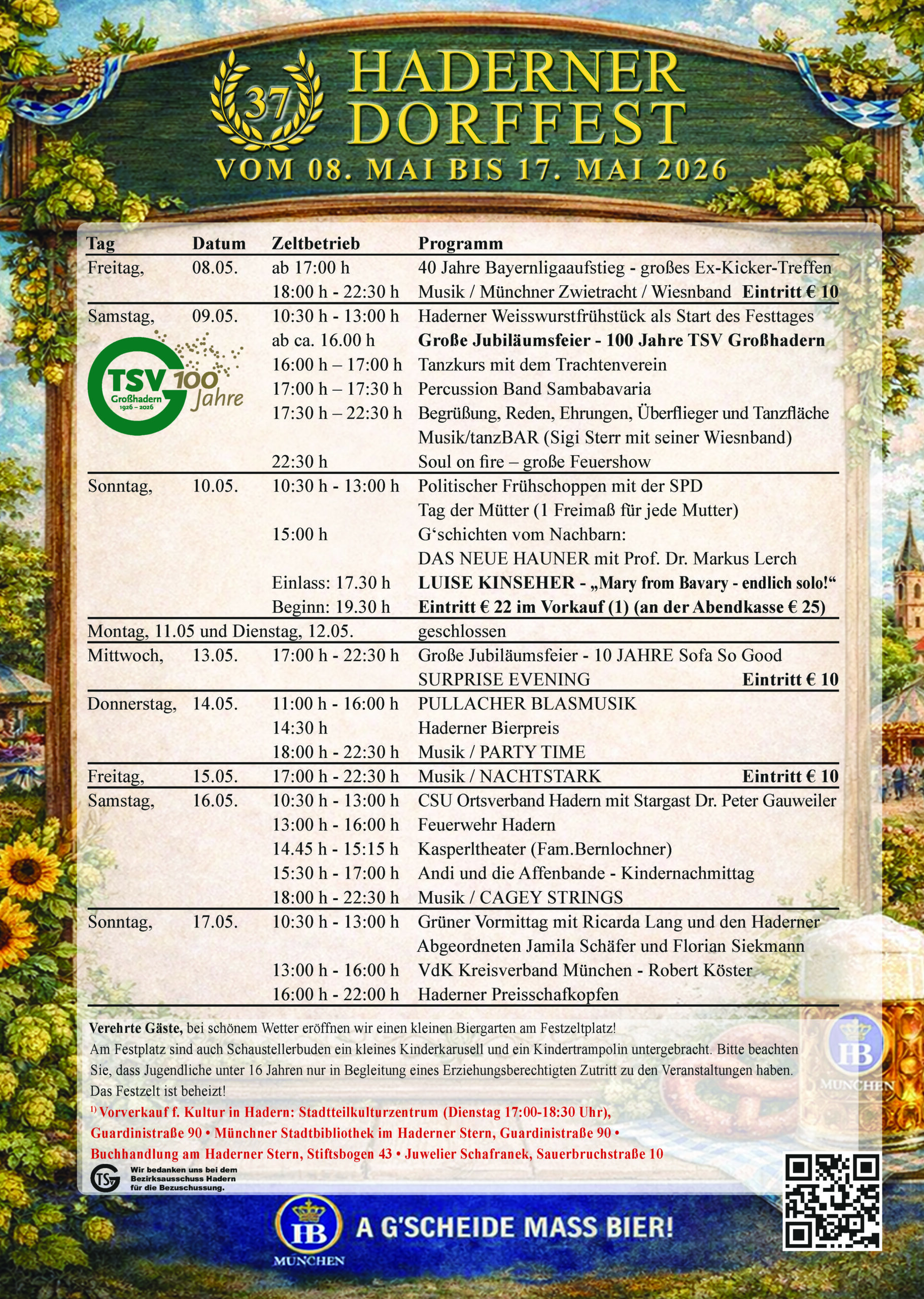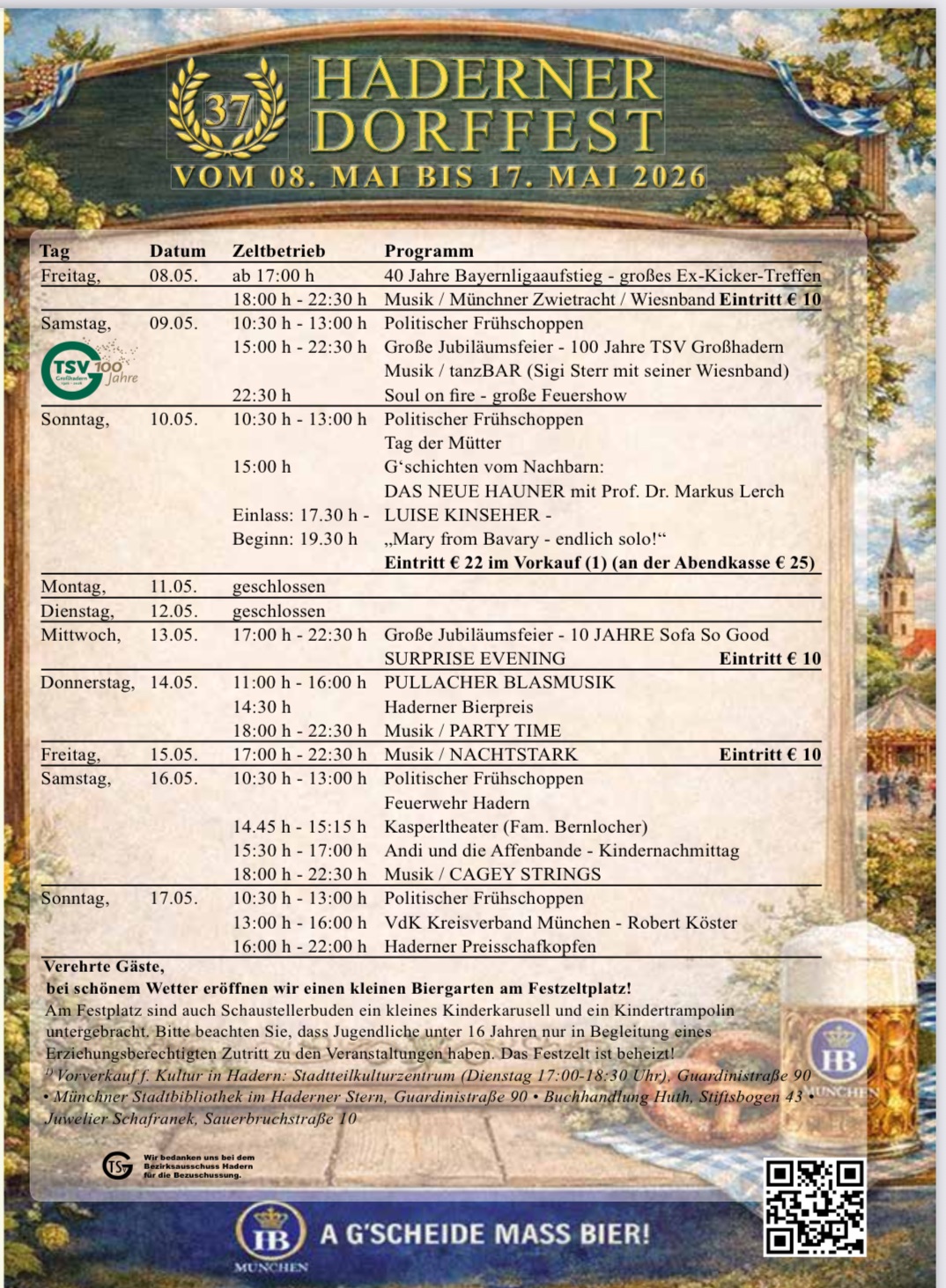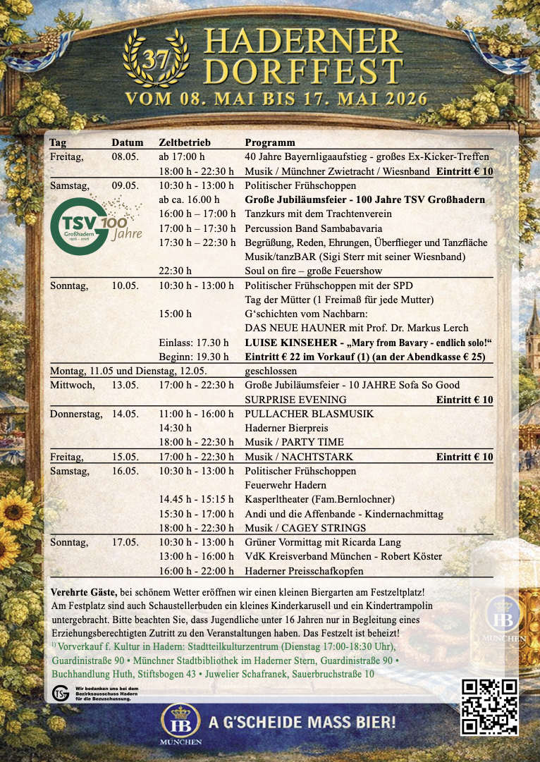 Kommt vorbei und feiert mit uns das Haderner Dorffest vom 08.05. bis 17.05! Freut euch auf tolle Programmpunkte, gemütliche Stunden im Biergarten und jede Menge Spaß für die Kleinen mit Karussell und Trampolin. Und wenn’s mal regnet? Kein Problem – im beheizten Festzelt geht die Party weiter!