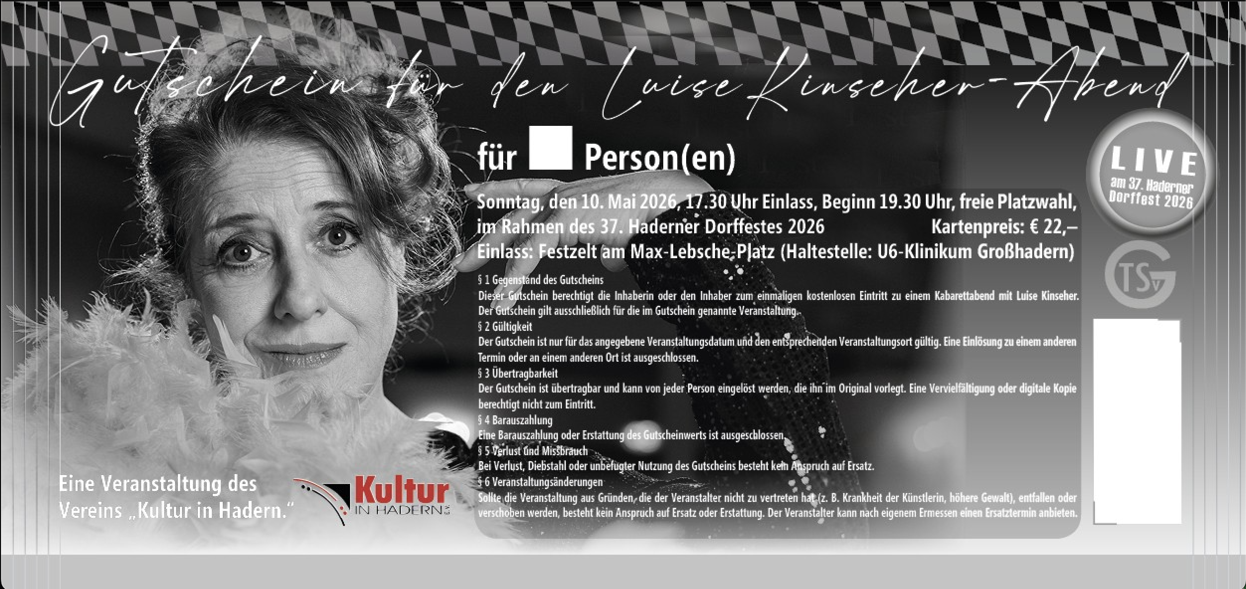 Am Sonntag, den 10. Mai 2026, laden wir euch herzlich zu einem besonderen Tag auf dem Haderner Dorffest ein! Freut euch auf einen unterhaltsamen Abend mit Luise Kinseher und Ihrem Programm „Mary from Bavary – endlich solo!“.